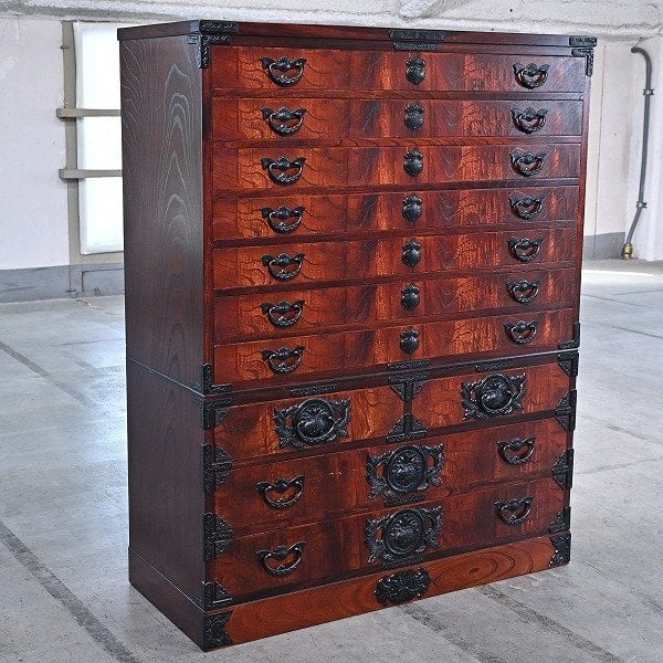 岩谷堂箪笥 60万「No.973」衣装タンス 欅材 拭漆塗り 南部鉄器金具 桐紋様 ケヤキ チェスト 伝統 民芸 着物 洋服 桐箪笥リビング 寝室 書斎【中古家具/中古インテリア/USED家具ユーズド家具/リサイクル】