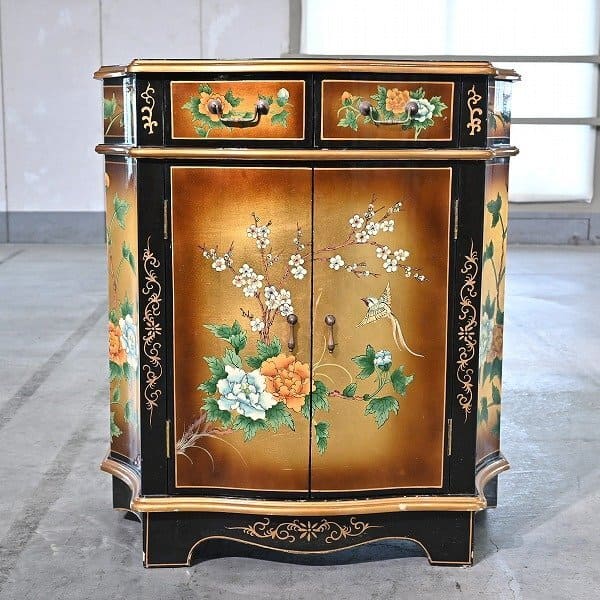 中国美術 チェスト シノワズリ キャビネット リビング 収納 棚 金箔 花鳥図 芸術 整理箪笥 収納 棚 家具 【中古家具/中古インテリア/USED家具ユーズド家具/リサイクル】