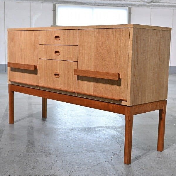 リビングボードは、中央が三段の引出し、左右が観音開きの扉になっています。