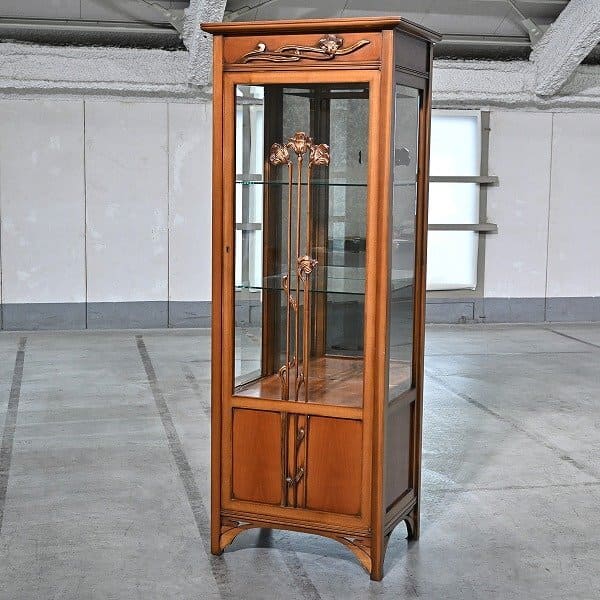繊細な木彫が美しく調和した、上質なガラスキャビネットです。