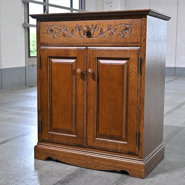 葉山家具 15万「花柄キャビネット」 オーク材 ガーデン 収納 クラシック 木彫り リビング 玄関 小物 寝室 書斎 アンティークテイスト ナラ【中古家具/中古インテリア/USED家具ユーズド家具/リサイクル】