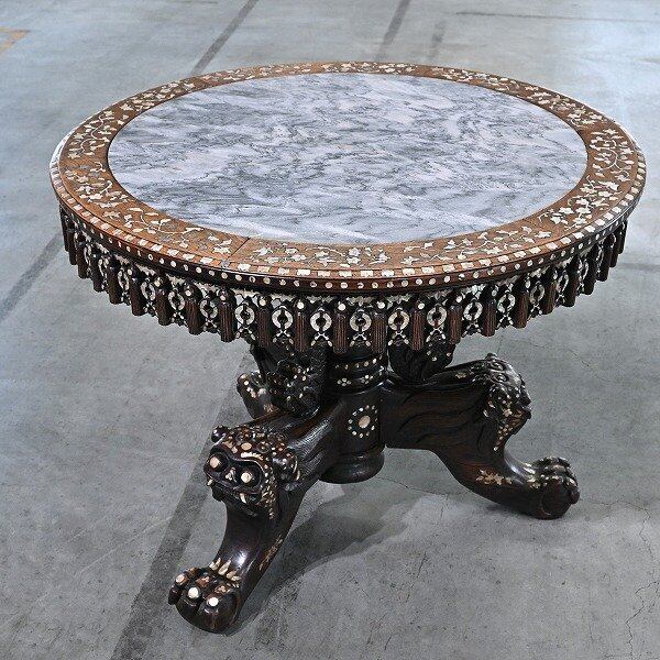 アジアンビンテージ 螺鈿テーブル パドック材 大理石 貝殻 獣脚 彫刻 獅子 ラウンド 丸 円卓 机 作業台 ディスプレイ 飾り棚 装飾 花