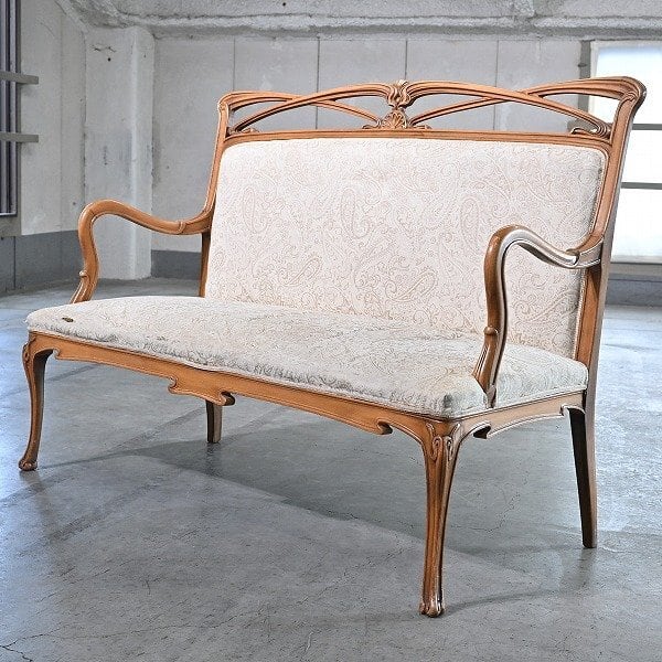 繊細な彫刻装飾が目を引くアンティーク調のソファです。