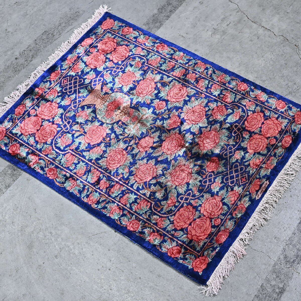 最高級 イラン製 クム産 ペルシャ絨毯 バラ柄 花 シルク フリンジ 花瓶 玄関 リビング 寝室 植物