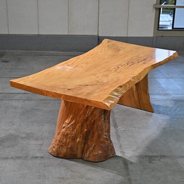 左右で異なるデザインの脚が、重厚な一枚板を支えながら、