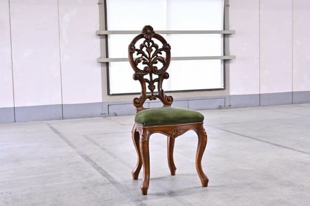 イギリス製 チッペンデール様式 アームレスチェア グリーン 彫刻 ダイニング 木製 アンティーク 椅子 クラシック 装飾 ロココ様式 実用性【中古家具/中古インテリア/USED家具ユーズド家具/リサイクル】