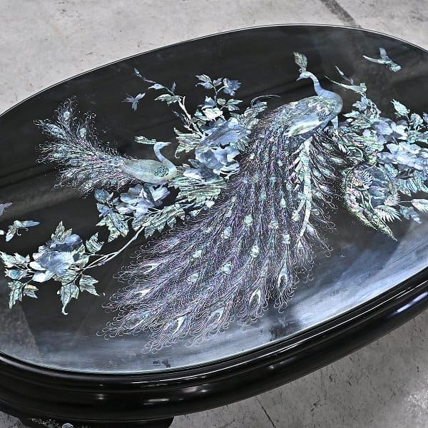 【引取限定】螺鈿細工 座卓 70万 孔雀 座卓 ガラス ちゃぶ台 ローテーブル センターテーブル 机 漆喰 彫刻 貝殻 動物 鳥 植物 中国 韓国【中古家具/中古インテリア/USED家具ユーズド家具/リサイクル】