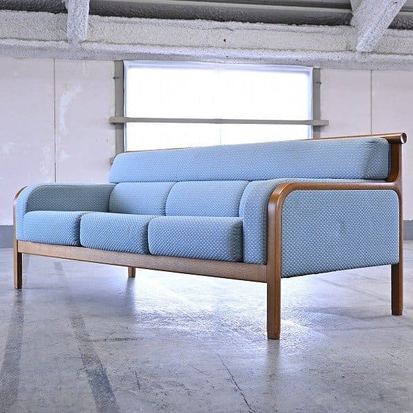 天童木工 トリプルソファ ナラ材 水色 剣持勇 3人掛け 剣持デザイン研究所 リビング ロビー 応接室 ファブリック クッション Tendo【中古家具/中古インテリア/USED家具ユーズド家具/リサイクル】