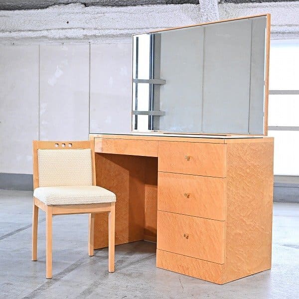 ★IDC大塚家具 45万「スプレンダー」ドレッサー チェアセット バーズアイメープル ガラス天板 鏡台 1面鏡 メイク チェスト テーブル【中古家具/中古インテリア/USED家具ユーズド家具/リサイクル】